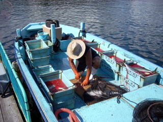 午後3時になって、お迎えの船と魚を運ぶ船が来た。釣った魚は筏に横付けした船上で〆て、
