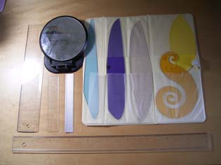 | 右から雲形定規一式、アルミ定規(15cm)、プラスチック定規(15cm)、30cm定規、(一番下)50cm定規。あと鏡。 【雲形定規】 曲線を引くための定規。必須ですね。 【アルミ定規】 カッターを当てる作業に必須です。たとえば、トーンを直線で切るとかフラッシュとか。プラスチックだと定規を削っちゃったり切り込んじゃったりするので。 【プラスチック定規】 集中線とか書くときに、全体が見えるので便利です。まぁ、アルミ定規1本あればOKなんですが…。 【30センチ定規】 コマ割とか描くのに便利です。コンパクトだし。 【50センチ定規】 投稿用(プロ用)原稿用紙はB4サイズなので、縦に線を引こうとすると30センチだとちょっと足りません。なので、あると便利です。 【鏡】 これを見ながら手とか描いてます。あると便利ですよ。 |