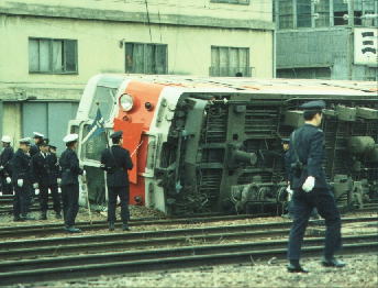 昭和48年12月、国鉄関西本線平野駅構内で脱線事故が ありました。確か運転士が停車駅を通過駅と間違えて、 スピードを落とさずに駅に進入したため脱線転覆し、 乗客の1人が亡くなったと記憶していますが、詳しい ことは新聞記事などで調べてみないとわかりません。 ちょうど休みだった私は、ニュースを聞いて天王寺から タクシーで平野駅へ駆けつけて撮影した次第です。