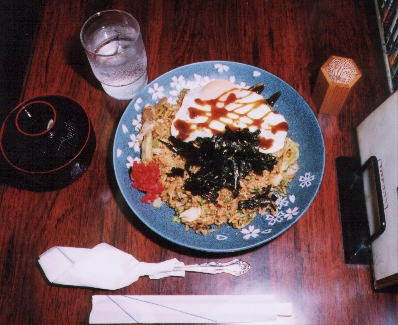 そ ば め し (神戸?) 神戸がその発祥地らしい?「そばめし」です。 やきそばのこまぎれと、やきめしをあわせたもので、 両方をいっしょに食べた〜い!という人向きの、 いかにも関西らしい発想の食べ物のようです。 (写真は「漫画喫茶ミッキー」のもの)
