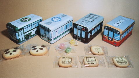 スイートボックス(大阪ほか) 電車の形をした缶に入った、色々なお菓子です。 右から京阪電車(電車の絵の入ったクッキー)、 阪急電車(カラフルなあめ玉)、神戸市営地下鉄海岸線と 神戸市バス(いずれもパンダの顔のクッキー)など。 バレンタインバージョン、クリスマスバージョンもあり、 2003年は阪神の優勝記念バージョンもありました。 JRの売店でも、同じような「電車の缶入りクッキー」 を販売しているようです。(各1缶600円くらい)
