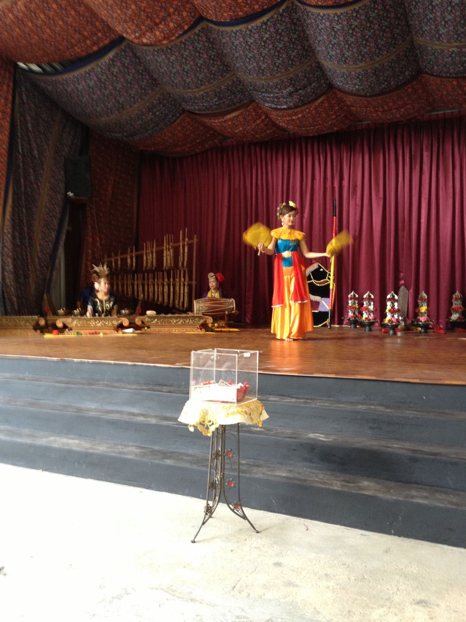 これからマレーシアの民族舞踊が始まるのですが、その前に使われる楽器などを触らせてもらいます。それはアンクルンという3本の竹筒を組み合わせた楽器。振って音を鳴らすもののようです