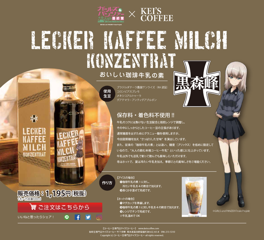 【LECKER KAFFEE MILCH KONZENTRAT】 エリカパッケージ \1,290 発売中!! ≪味覚特徴≫ 保存料・着色料不使用!! 牛乳のコクには負けない生豆配合と焙煎レンジで調整し、 その中にしっかりとしたコーヒー豆の主張があります。 通常糖度を出すためにグラニュー糖を使用しますが今回 甜菜糖を加えさっぱりした甘味を演出しています。 又、従来の珈琲牛乳の素とは違い糖度(ブリックス) を低めに設定しているので、大人の飲む本格 コーヒー牛乳といった感じに仕上がっています。 牛乳以外でも豆乳で割って飲んでも美味しくいただけます。 冬はホットで夏は冷たい牛乳を加え季節ごとの 美味しさをご堪能下さい。 |
