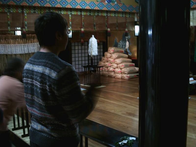 さあ祈祷です。 うちのお米に向かって(?)祈祷してもらっています。 写真の外で私も一緒に念を込めているはず。 む〜ん! 合格! 祈願成就! |