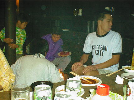 それにしても、寒い(ちなみに、外でやってます)。デザートにアイスをほおばって気合を入れなおし、2次会(?)に突入した。場所は、コテージの中。いきなり皆にラーメンが振る舞われた。かわきものも。ここからがReverseの先輩方のパワー全開であった。ラーメンは固さがどうのと注文をつけながら3杯以上喰ったように記憶している。えどさんとブー氏シェフが実は仕事でつながりがあることも発覚し、話が弾む。なんか、シェフの感じが玉ねぎをむいていたときとかなり違うような…。まったりとした時間が過ぎていき、いつの間にか人数がずいぶん減っていた。このへんでCyberの面々は退散させていただいた。2時を過ぎていたような気がしたが、定かではない。副会長は泊らずに帰っていった。そんなに恐い人なんですか…。しかし、Reverseの先輩方は何時までやっていたのだろう。