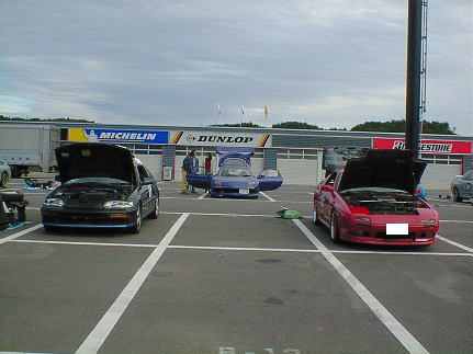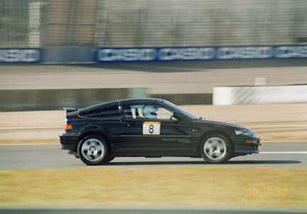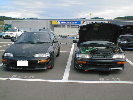 そうこうしているうちに時計に目をやると、なんと40分も経っているでわないですか。今日は1時間1本勝負なので途中休憩を挟むつもりでしたが、水温OK、ブレーキ、タイヤはちょっと怪しい感じがするけど…まあいいか。で、1時間走りっぱなしに決定!と、後ろから強烈なプレッシャーが。いや、音が。まだ遠いですが、あれは陰号のようです。S字、V字、ヘアピン、かなりつめられました。下りのストレート!ブレーキングがしょぼいため、完全に張りつかれました。まあ、速さの違いはわかってますが…最終コーナーを立ち上がり、2台のCR−Xが並んでホームストレートを駆け抜けます。う〜このシーンを外から見ていたかった。当然、最終コーナー立ち上がり速度の差からじわりじわりと追い抜かれます。ありゃりゃ、同じ車なのになぁ。筑波のときもそうでしたが、腕の違いを実感してしまいました。その後は自分なりに攻めて(特に下りストレートは攻めきれませんでしたが…)今日の走行を終了しました。やっぱりサーキット走行は楽しいです。
