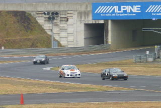 準備終えてドラミ終えていざ走行。やっぱりやまないね、雨は。今日は雪の予報が出ていたように気温もかなり低く、滑りやすそうです。 慣熟走行終えてもタイヤ暖まっている気がしないので、ゆっくりと。丁寧にブレーキ踏まないとすぐロックしますね。じわじわとペース上げていくとZ33に遭遇!もちろんバトル開始です。(^^) あたりまえだけど(むこうは3.5L)ストレートはかなり速い!!でも車重のせいなのかコーナーはきつそう。暴れる車を押さえ込んで走っています。(タイヤはネオバ)130R〜S字はこっちの方が速いですね。ブレーキはブレンボ付けているだけあってあの車重でもきっちりと減速します。なので、速い速度から奥まで突っ込んでブレーキしていく姿は、見ているこっちがドキドキします。 前後入れ替えて走って楽しんで、途中でピットイン。 |