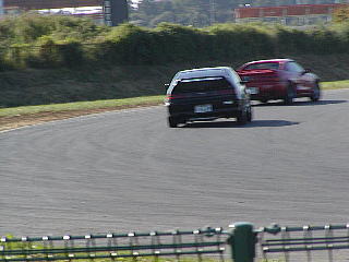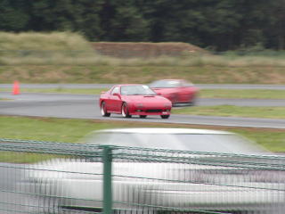 …外周周回用のコースがあって良かったです。皆さんも雨の日には気をつけましょう。特に、普段から"S"を履いている方々!!(笑)。私は事なきを得ましたが、デルソルとか、ロードスターとかがコースアウトして止まってました。特にデルソルは重傷だったようで、午前中いっぱい修理して、そのまま走らずに帰ってしまったようです。午前中は雨が降り続き、スピードが出せないため良い練習になりました。幸いにも午後は良い天気になり、目一杯走れました。今回も1コーナーでリヤを流して走ってました。これはかなり上達した模様です。と、ちょっと前のFFサニーがかなりリヤを流して走ってるんです。しかも、超ロールしながら。運良く(?)後ろについたので、1コーナーでFFツインドリフトやっちゃいました(注:軽く10mは離れてましたね)。リヤを流して走るのってすっごく楽しいです。当然、たまにはまわりますけど。で、本人はスキール音を響かせながら格好良く走ってるつもりなんですが、弟曰く「いっぱいいっぱいみたい…」だと。理想と現実の狭間は深い…。 |