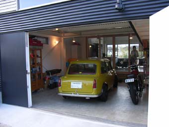 Dog Run−人と犬が共生する家− 左:ご主人の趣味の車とバイク。いつもリビングから車が見えるように計画されている。 右:ゆったりとした階段を上がる人と犬 ■鉄筋コンクリート造+鉄骨造■地下1階地上3階■敷地面積150.00u(45坪)■延床面積161.30u(49坪) ■掲載誌:新しい住まいの設計2007年4月号/Memo2007年12月号/犬と暮らす家VOL4 Works/House