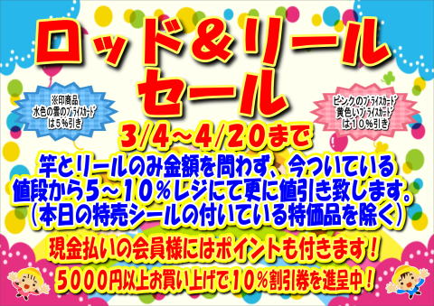 ![]() 3月4日から4月20日までロッドとリールを割引させていただきます。 5,000円以上お買上げの方には割引券も付きますのでお買得になっていますよ。 |