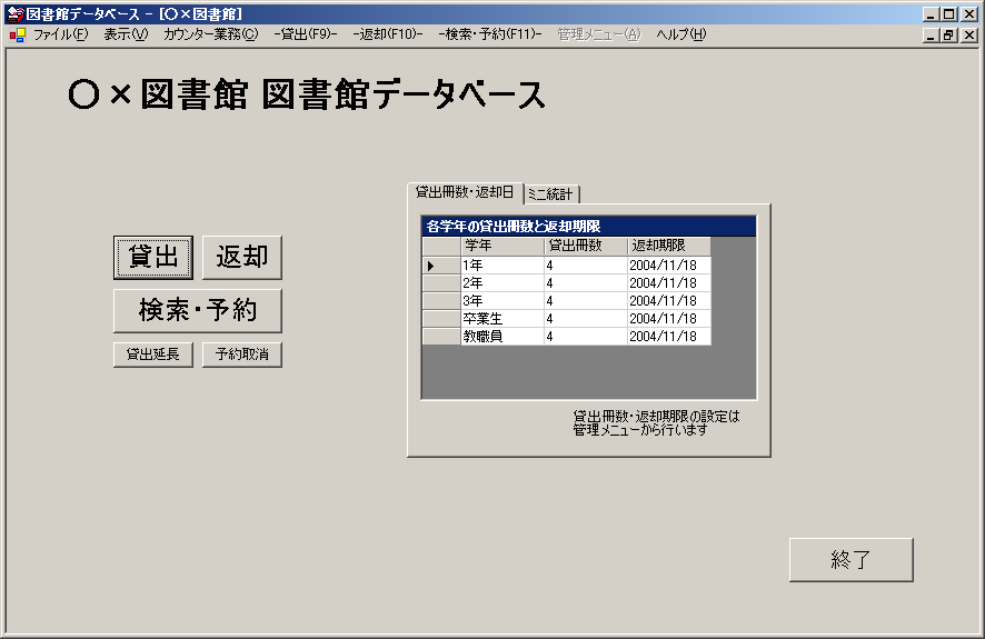 このページは、ソフトを最初に起動させたときに表示されます。画面左のボタンから、カウンター業務で多用する貸出や返却等機能を呼び出せます。右側に